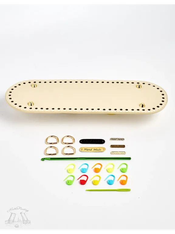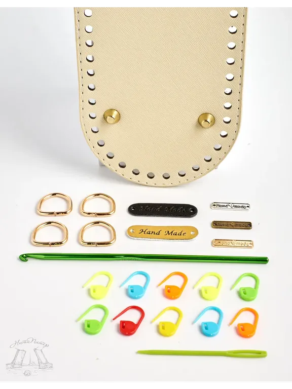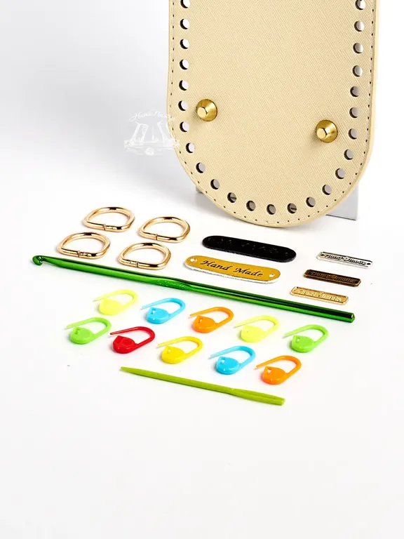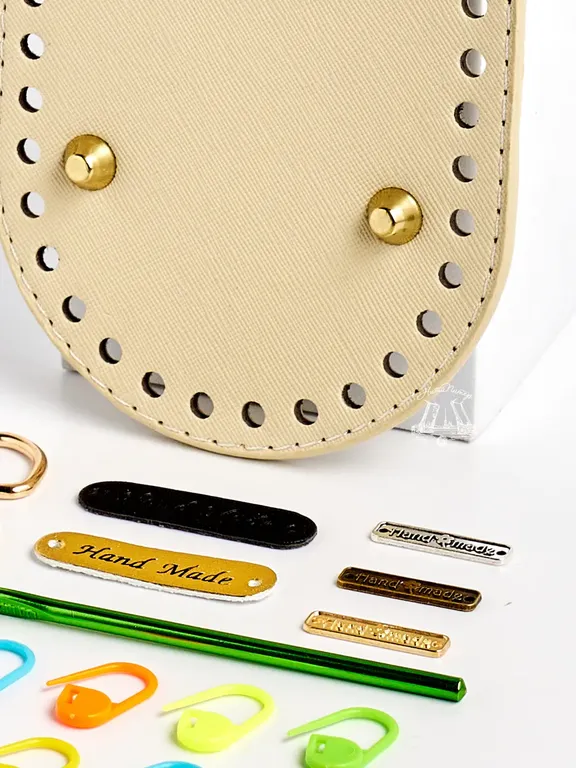 Можно дополнить набором для вязания: игла пластиковая, 3 маркера , 1 бирка "hand made" золото, 2 полукольца золото.